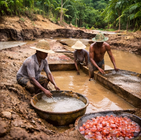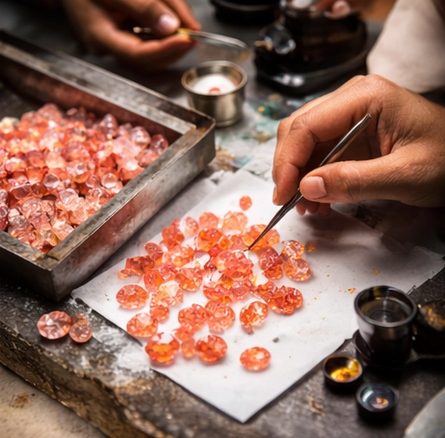 Padparadscha sapphires are extracted as rough corundum crystals found in alluvial deposits.